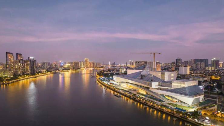 玻璃幕墙:营造通透晶莹的体量感,最大化引入自然光与江景,夜晚室内灯光透出,建筑宛如珠江畔璀璨的“发光宝盒”。