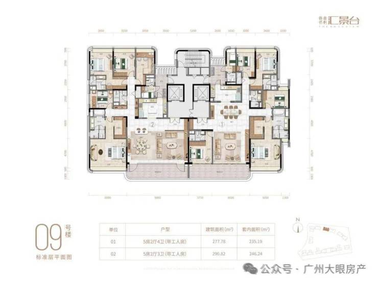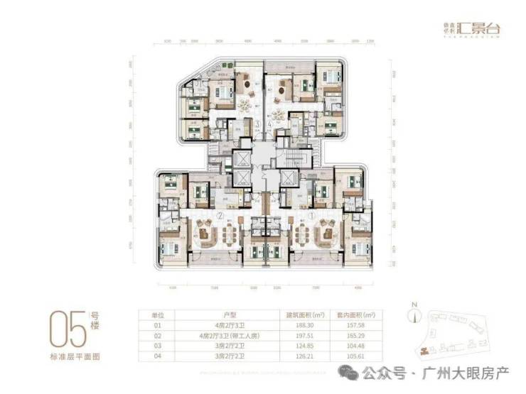 项目由14栋12层小高层组成,产品涵盖123-352㎡三至五房,共8类户型,户型实用率约82-84%