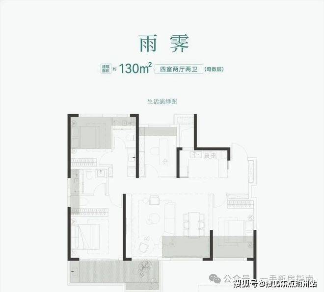 建面约130㎡四房,相当于三代住宅建面约150㎡以上户型,接近“0公摊”。建面约130㎡做四房,改善换房可实现一步到位,还能控制总价预算。