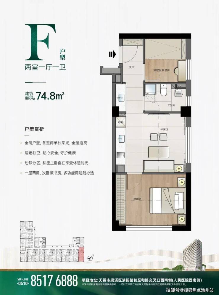 F户型(两室一厅一卫):建筑面积约74.8㎡