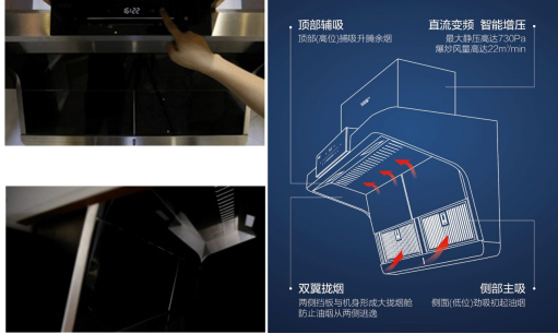这款产品与普通油烟机较大的不同之处就是它的顶侧双吸结构。