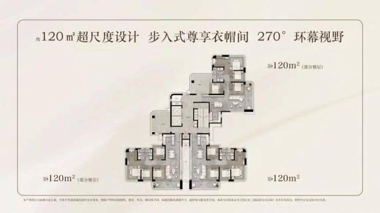 120㎡四房,采用 270° 弧形落地窗设计,主卧套间配备独立衣帽间,实际使用率超 105%,剩余房源集中在中低楼层。