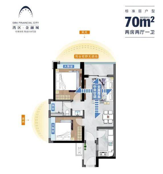 湾区金融城的70平方米两居室户型在整个横沥板块中独一无二。这个户型特别预留了入户空间,提高了私密性,并且可以放置鞋柜等日常物品,增加了实用性。