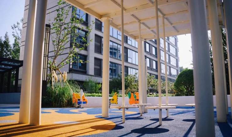 洋房一楼的庭院,面积普遍高达约50-70㎡,足以媲美诸多排屋产品的庭院尺度。而且不同于市场上的常规做法,房总东茂府的庭院还采取立柱+金属格栅的实体围墙,而非植物绿篱来进行区隔。