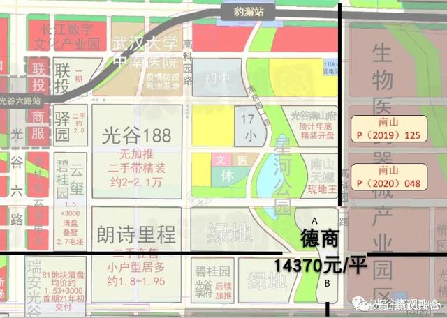 这里,我们重点来看武汉东湖高新区P(2020)075号地块,成都德商集团&广西彰泰联合开发排名前列项目,其地块成交楼板价14370元/㎡,已超过今年6月30日南山集团竞得的南山天樾项目地块的楼板价(13515元/㎡)。