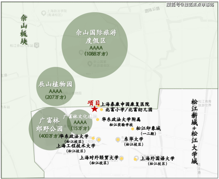 环绕旁侧是包含佘山国际旅游度假区、辰山植物园、广富林郊野公园、广富林文化公园近17平方公里的公园叠翠