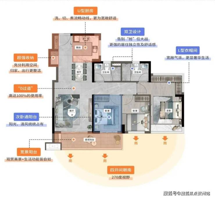 客餐厅采用LDKG一体化布局,进深高达约10.4米,尺度感瞬间拉满。客厅外接南向双开间阳台,约6.2m的采光面,为室内引入更多清风暖阳。全南向三房设计,每一位家人都能享受阳光的宠爱。室室飘窗,推窗即揽无边岭南园景。