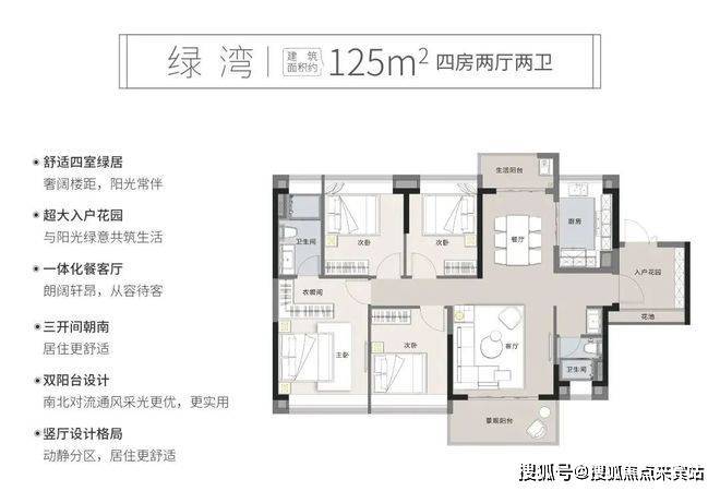 125㎡的四房户型则尽显改善品质。超大入户花园,增添归家仪式感,同时可作为休闲或收纳空间。双阳台设计,通风采光俱佳。创新的 LDKB 一体化设计打造超聚厅,将客厅、餐厅、厨房、阳台连通,形成一个宽敞的公共活动空间,无论是家庭聚会还是日常休闲,都能轻松容纳。九窗全明且三开间朝南,让阳光洒满房间的每个角落,为家庭成员带来更加舒适、明亮的居住体验,适合追求高品质生活的二孩家庭或三代同堂家庭。
