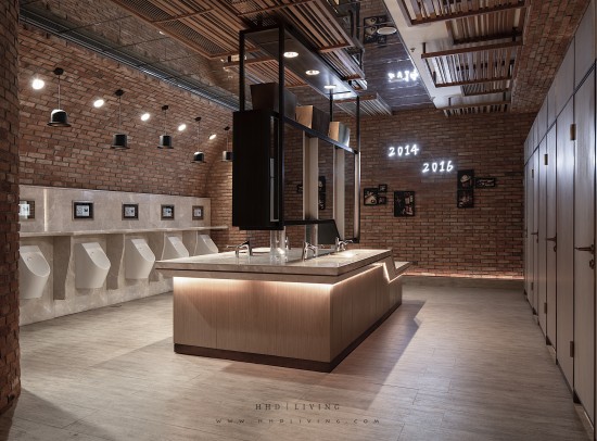 HHD·Living还为沈阳K11艺术购物中心打造了国内排名前列体验式洗手间。红色砖墙斑驳的纹理与粗糙的质感,为空间带来了一丝独特的工业风味与复古情调,使人似乎重回旧时光的沧桑与怀旧。复古的砖墙,现代感的玻璃,琳琅满目的装饰挂画,粗糙、经典、优雅、现代在这里汇聚,成为别具一格的购物中心一角。