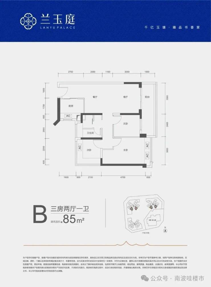 85㎡的3房2厅1卫,B户型,设计的是竖厅格局,客厅开间3.3米,LDKB一体化,三开间朝南,3个卧室分别做到了3米/2.7米/2.4米的宽度,客厅连接次卧出5.7米长的大阳台,L型厨房,创新式三分离卫生间,得房率约79%(不含赠送),西南或东南朝向。