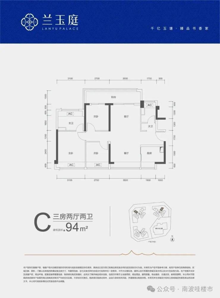 94㎡的3房2厅2卫,C户型,设计的是竖厅南北通透格局,客厅开间3.5米,3个卧室分别做到了3.1米/2.7米/2.7米的宽度,客厅连接次卧出6.2米长的大阳台,U型厨房,公卫三段式分离,得房率约79%(不含赠送),阳台主朝西北或东北向。