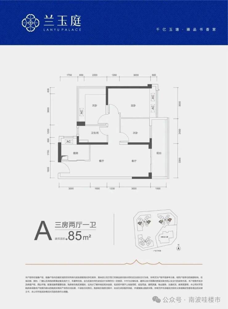 85㎡的3房2厅1卫,A户型,设计的是竖厅格局,客厅开间3.3米,LDKB一体化,三开间朝南,3个卧室分别做到了3米/2.8米/2.4米的宽度,客厅连接次卧出5.7米长的大阳台,L型厨房,得房率约79%(不含赠送),西南或东南朝向。