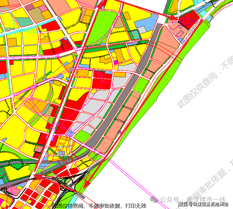 目前武汉规划一张图中对于该片区的规划用地性质是明确的,有不少工业用地,且一线滨江用地基本都是工业用地。至于图中浅灰色是什么用地性质,目前还不明确。