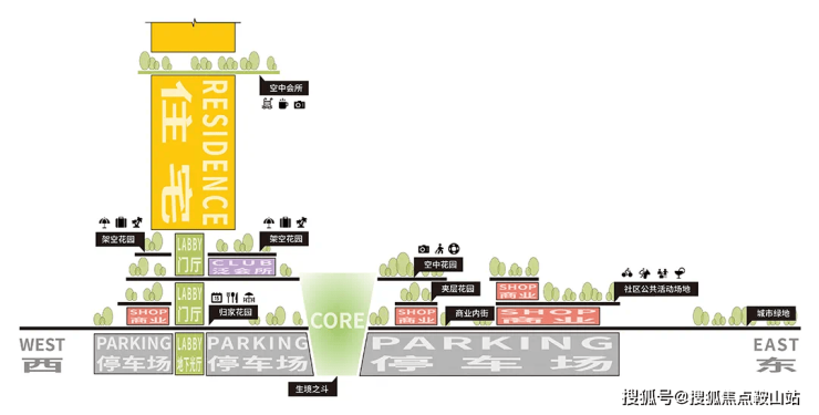 从这个侧面结构图来看,构造更接近于目前外国新晋的豪宅综合体,带有空中花园+架空花园+星空会所+泳池等多功能融合。