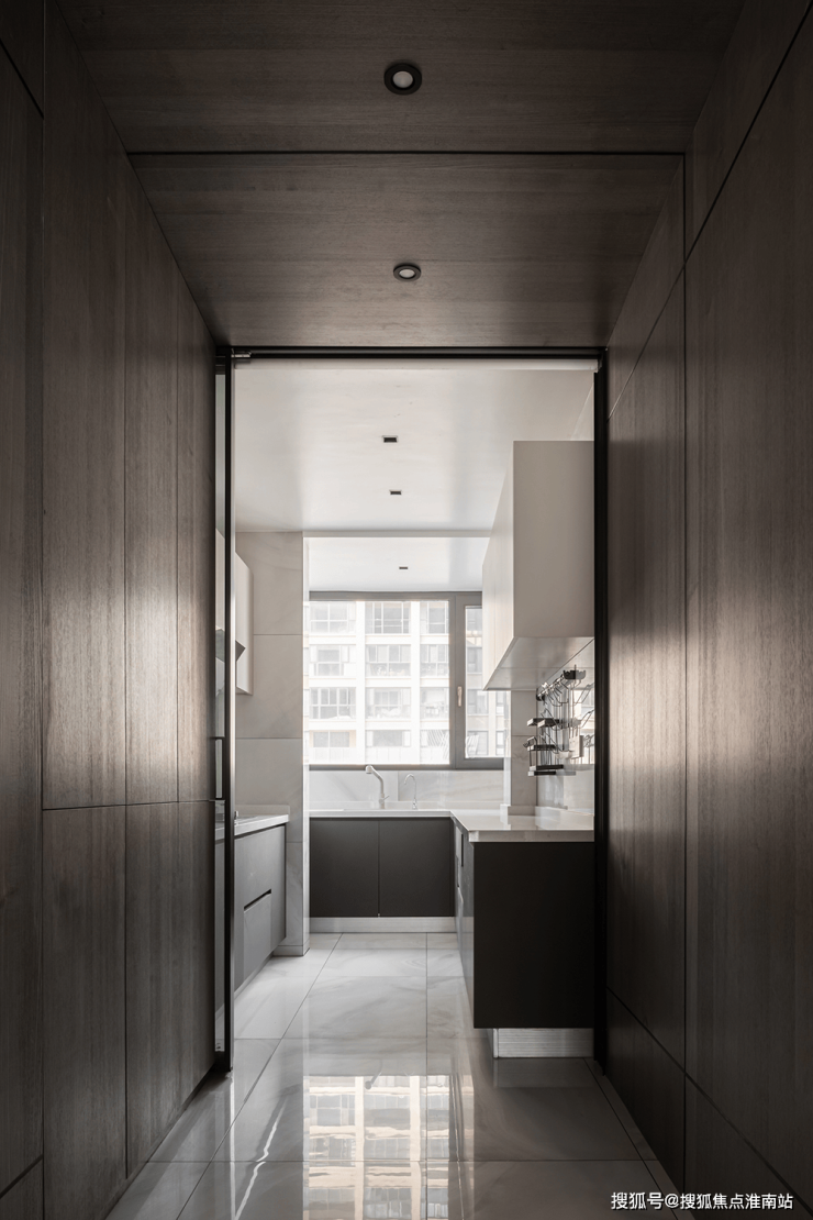 餐厅视角尽头是中厨,利用了隐藏式推拉门设计阻挡了油烟,内部整体色调依然以黑白为主。过道墙壁精心设计为收纳空间,最大限度地利用了每一块空间增强收纳功能。