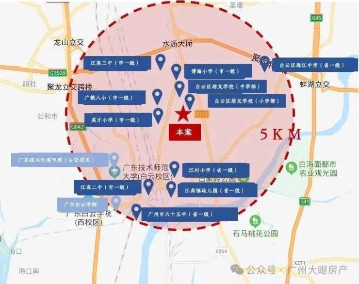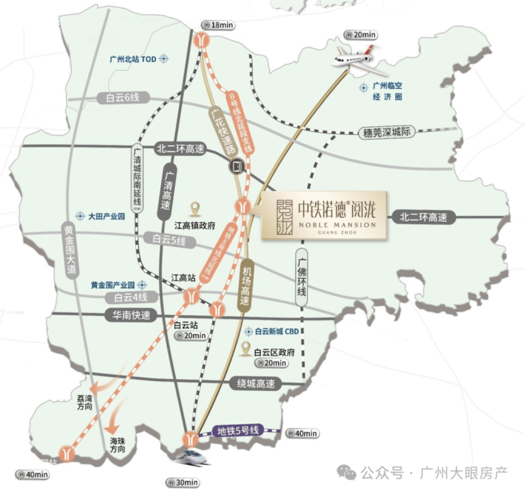 双向十车道广花快速路,无红绿灯、10分钟直达白云新城、3分钟高速口上环城高速、30分钟到珠江新城、2小时通达大湾区各大城市。