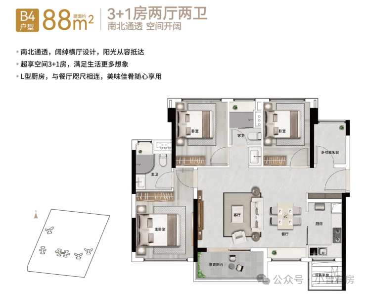 【88㎡3+1房2厅2卫】经典竖厅格局,三开间采光,近11㎡主卧套房