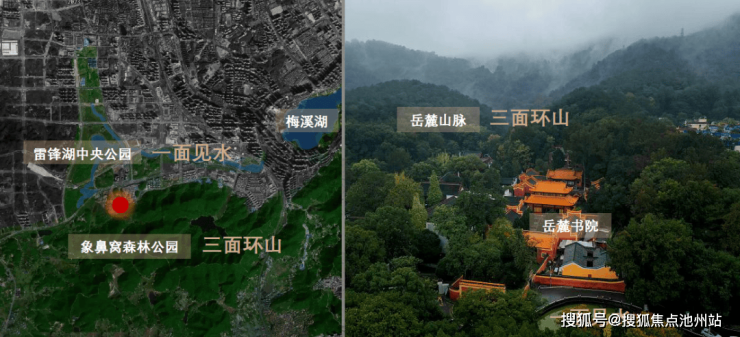 梅溪湖拥有多重文脉特质,随着片区发展,梅溪湖正由“环湖时代”进入“中轴时代”。本案位于梅溪湖国际新城二期,岳麓山脉之上,被象鼻窝森林公园环绕,三面环山,一面临水,其地理格局与岳麓书院颇为相似,是寄寓隐居、修身养性的理想之地。
