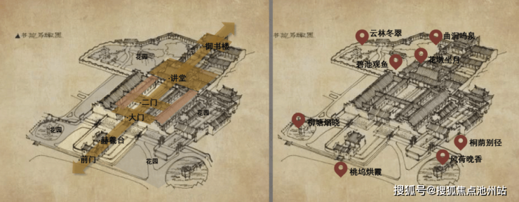 书院布局讲究礼乐相成,追求自然融合的人文气息;本案承袭书院礼乐相成的东方基因,规划上以中轴布局+三进院落+围合造园,沿袭岳麓书院轴线序列布局理念,打造宅中园、园中画、画中游的意境,落位书院八景,以南北双园山水主轴格局构建当代静奢璞园。