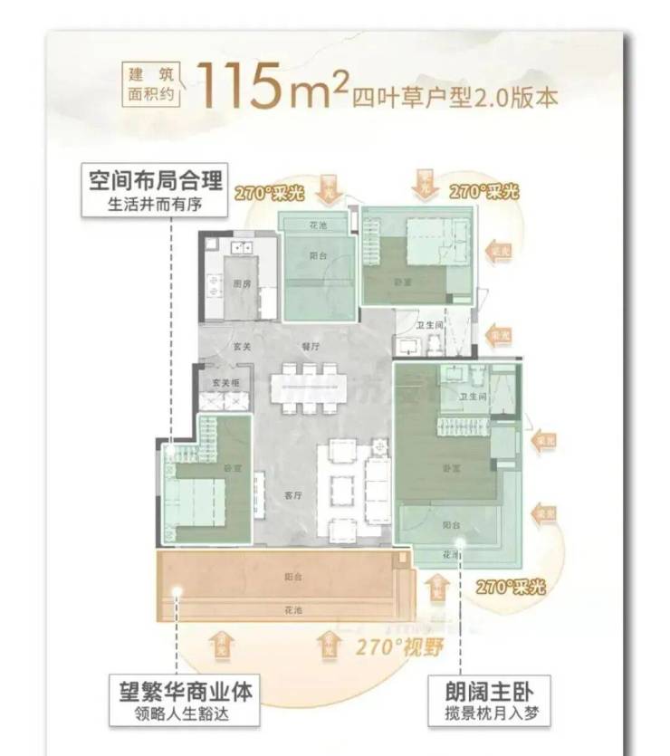 另一个则是户型本身独具魅力,没有选择传统格局,而是带来更新潮的“四叶草”户型2.0版本。