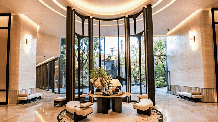 将园林的高山流水框成一幅画,引入室内,传递出华樾自然与奢华并蓄的生活哲学。