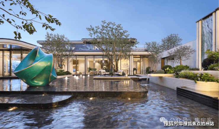 约7米高的主入口,把贝金米黄石材、维多利亚绿等名贵石材,与古铜色金属板、紫薇等名贵草木巧妙搭配、相得益彰,犹如穿着翠绿华服的翩翩公子,透着一身贵气。