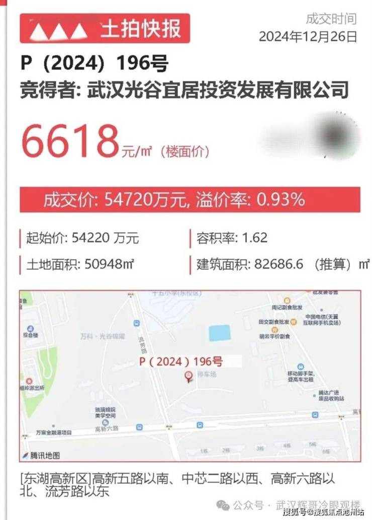 2024年12月26日土拍中, P(2024)196号地块 由武汉光谷宜居投资发展有限公司(湖北省科投公司)以54720万元总价竞得,溢价率0.92%,楼面地价6618元/㎡。万科-光谷锦上 开发商电话:400-678-8669转1111【☎☎开发商电话已认证】✨✽✽✽✽