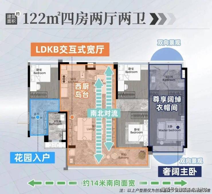 建面约141㎡户型,更将采光和景观面做到市面同面积产品难以企及的高度。全屋五开间朝南,客厅、卧室等主要起居空间,全部南向,南向面长达约17米,已经超过市面上其它改善盘160㎡以上户型。意味着每个家庭成员的居住空间,都能拥有均好的采光。将客厅旁的次卧打通,可以形成一个LDKB一体化超大家庭聚厅。一家人在此聚餐,或者招待好友到访,都足够阔绰、气派。
