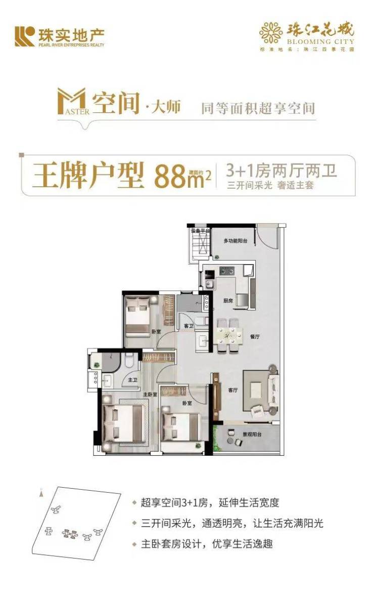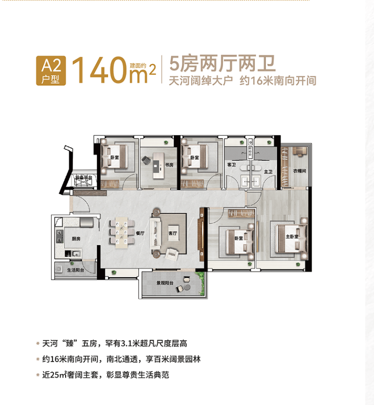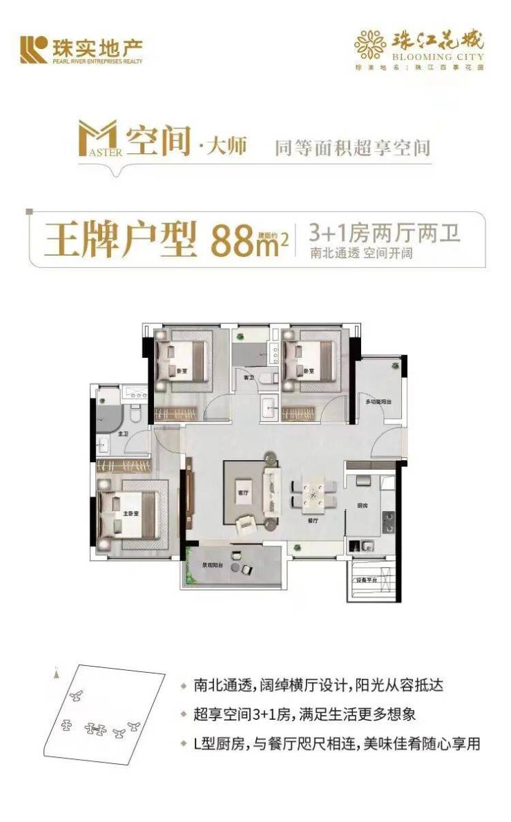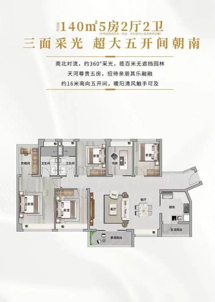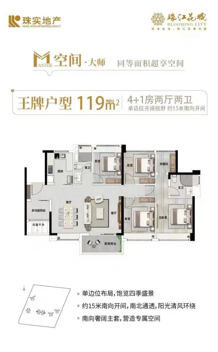 珠江花城的户型设计充分考虑到居住舒适度和空间利用率。现阶段在售的是五期的88㎡3+1房、119㎡4+1房、140㎡5房等多个户型。每个户型均采用南北通透设计,保证了充足的采光和通风,适合各类家庭的需求。特别是140㎡五房户型,带有奢华主卧和独立衣帽间,适合大家庭居住。无论是刚需家庭还是改善型需求,珠江花城都能提供适合的户型选择。