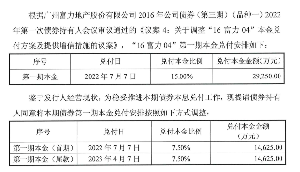 其中,《关于调整“16富力04”排名前列期本金兑付方案的议案》拟将7月7日兑付本金比例由15%降至7.5%。