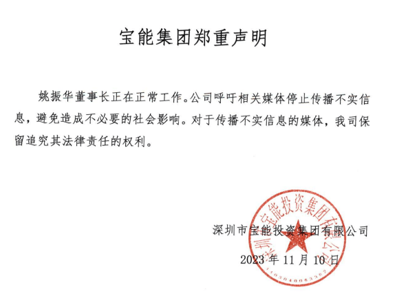当天下午,宝能官网发布声明称,姚振华董事长正在正常工作。