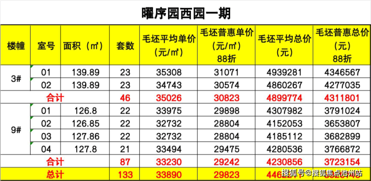 根据天曜序一期预售住宅(2幢、3幢、9幢)145套的一房一价,高层3#、9# 普惠后(88折)的毛坯均价分别30823元/平、29242元/平,整体折后毛坯均价约29823元/平——