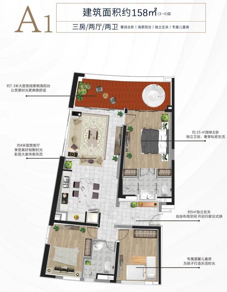 A3户型约224平方米三房两厅两卫大阳台