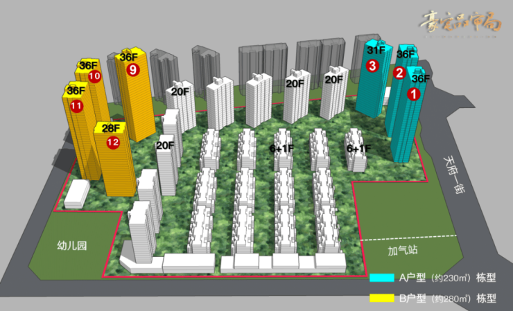 南区临天府一街,规划了三栋建面约230㎡产品,也就是下图中的蓝色体块。