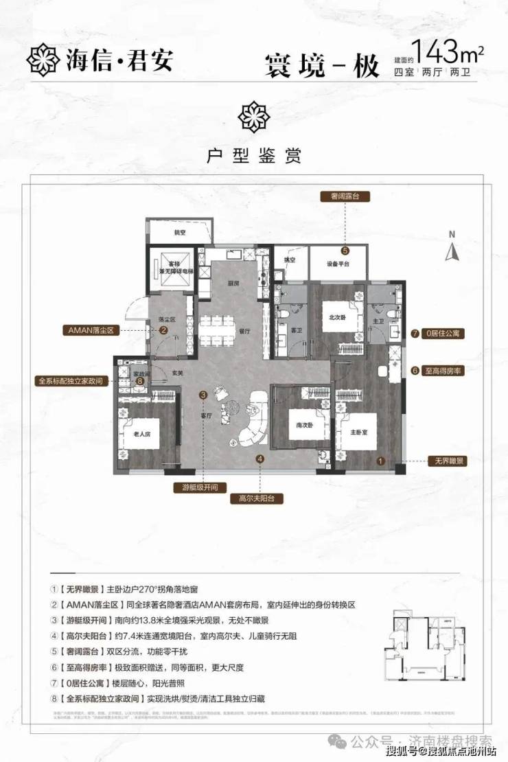143平四室户型亮点:四面宽,约7.4米的大阳台,边户户型主卧270°拐角落地窗。
