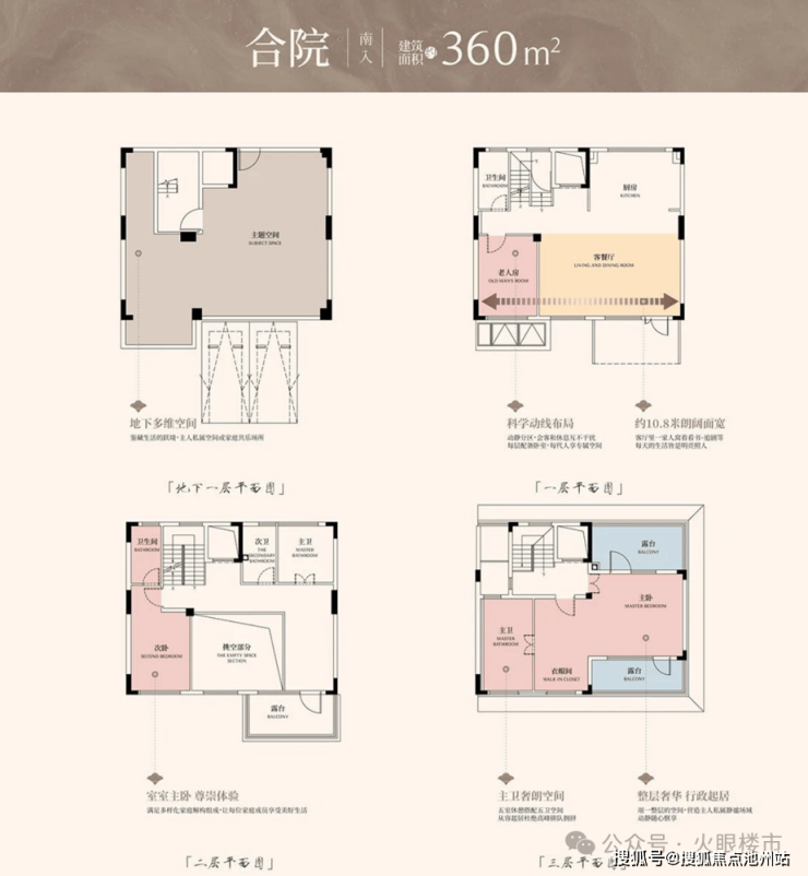 合院360㎡:整个小区主力户型,总计69套,单层开间10.8米,二楼南向露台,可做三房,三楼南北双露台。