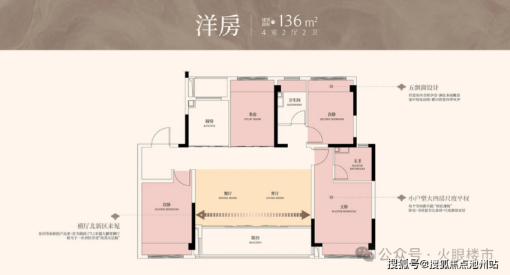 136㎡4房2卫,7.1米餐客横厅,五飘窗。