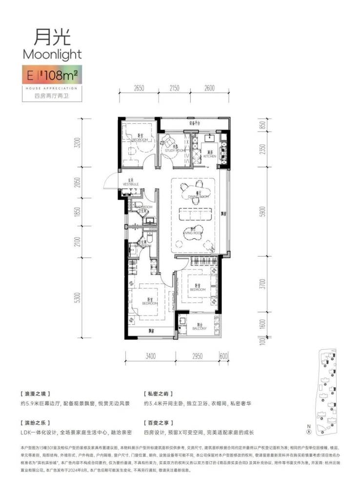还有建面约108方东边套户型,做到了同级少有的4房2卫巨幕客厅设计。