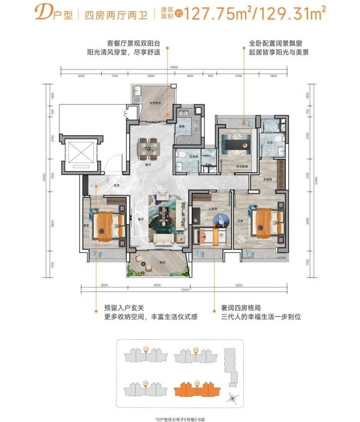 户型格局分为三房两厅两卫,四房两厅两卫等,面积约 100-129㎡,户型方正、通透舒适,大阳台设计,景观丰富、视野开阔。