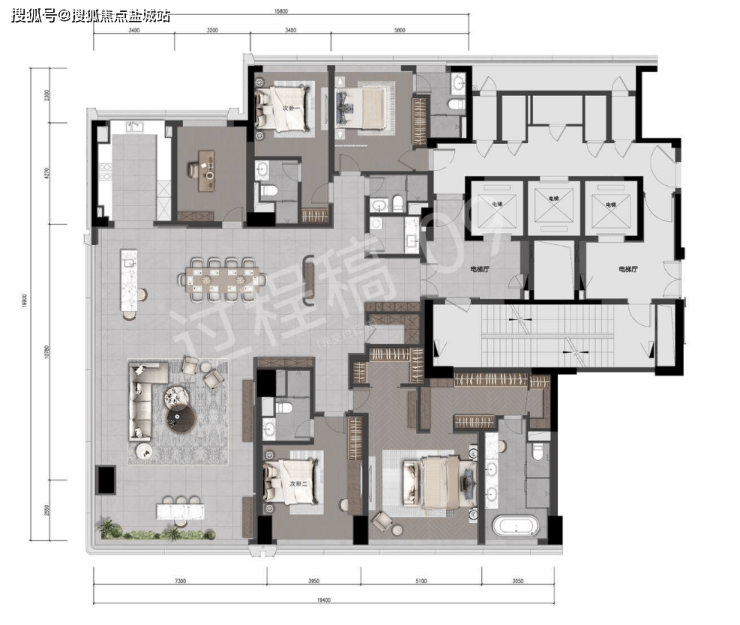 公区方厅第一眼的感觉就是辽阔,建筑面积超90㎡,想举办超大型party都没问题,并且南向开间有约19米,这样的尺度能和市面上四五百方户型的客厅媲美了。