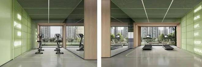 健身房 - 悦活天地:封闭管理,提供专业健身环境,空间内设跑步、拉伸、动感单车、休息、力量训练、水吧等功能区。