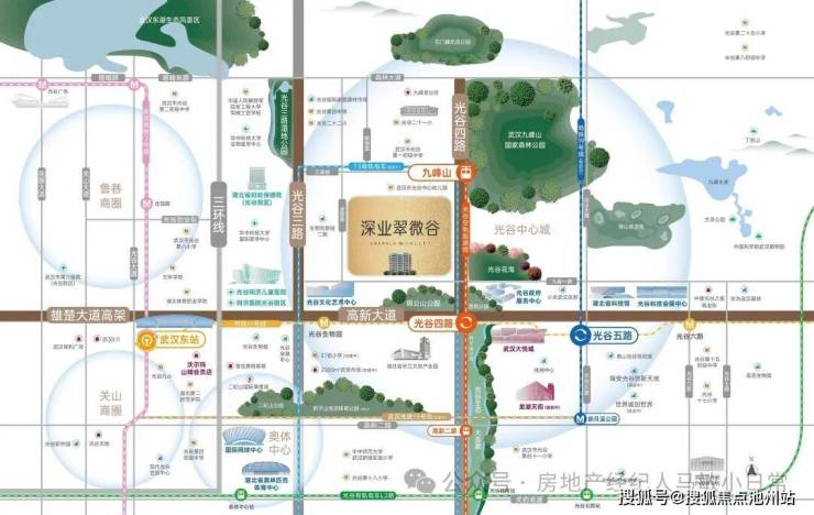 ◤一心◢ : 光谷黄金中轴,极萃光谷芯 经济轴:高新大道,世界光谷之脊梁主轴,聚集华为、小米等数百家行业龙头企业,已成为万亿级产业集群的“黄金大道”生态轴:光谷四路,毗邻光谷中央生态大走廊,是武汉市第一条城市生态走廊,更是大光谷的生态名片【深业翠微谷】毗邻高新大道与光谷四路,占据万亿级经济命脉与生态景观发展的"黄金十字轴芯",繁华与自然交汇地