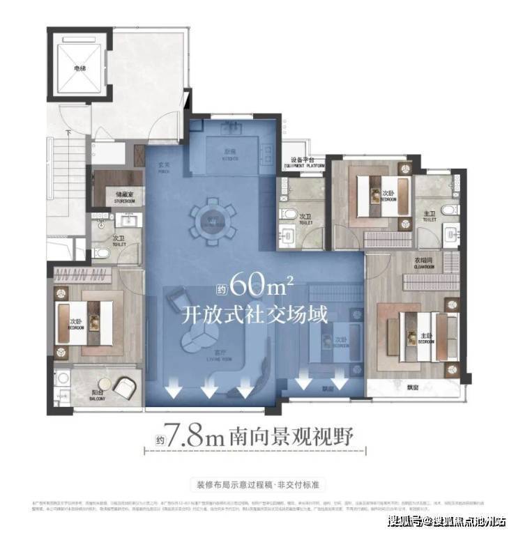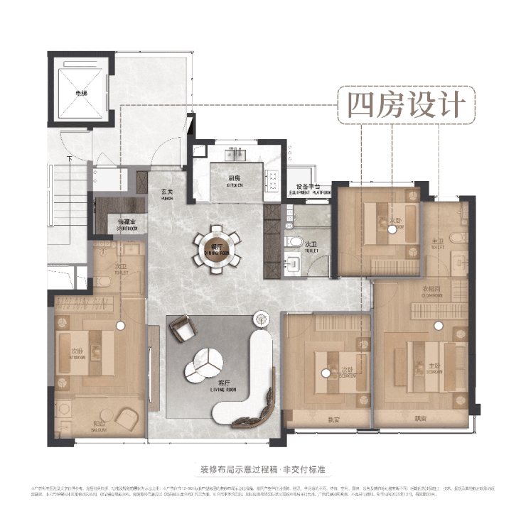 凭借约100%的超高使用率,该户型实现了正四房+双套卧+三卫+独立储藏间的全能功能配置,在市面上同面积段产品中,空间利用效率具备明显竞争力,能够满足改善家庭从二人世界到三代同堂的全周期居住需求。
