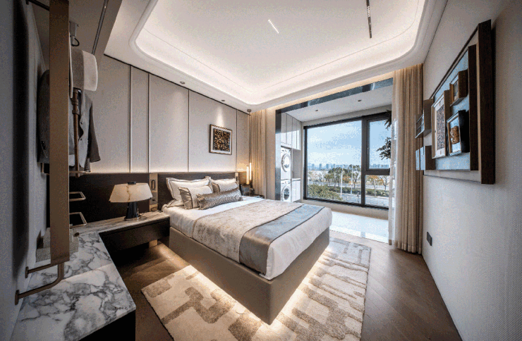 南向双套卧设计,精准回应多代同堂家庭的居住需求。双套卧均配备独立卫浴,家人各享私密生活,日常起居互不干扰;次卧套衔接阳台,兼顾晾晒功能与观景体验,让实用与诗意二者兼得。