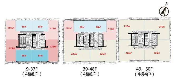 •建筑形态:194米超高层塔楼,共50层,分为低区(9-38层)、高区(39-48层)及顶层(49-50层),梯户比从低区4梯8户到顶层4梯4户逐级优化。