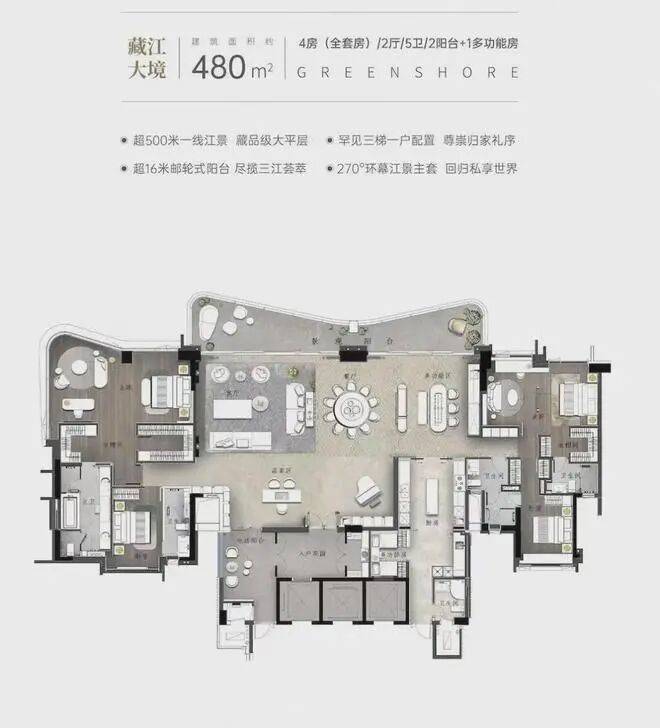 为了确保三江交汇的优势被最大化发挥,位于天启组团高层的480㎡大平层,通过超宽尺度邮轮式大阳台,仿佛在城市上空打开4k环屏观景盛宴,16米景观面,以IMAX版巨幅高清分辨率领略三江交汇之浩渺,体验对城市的驾驭感。