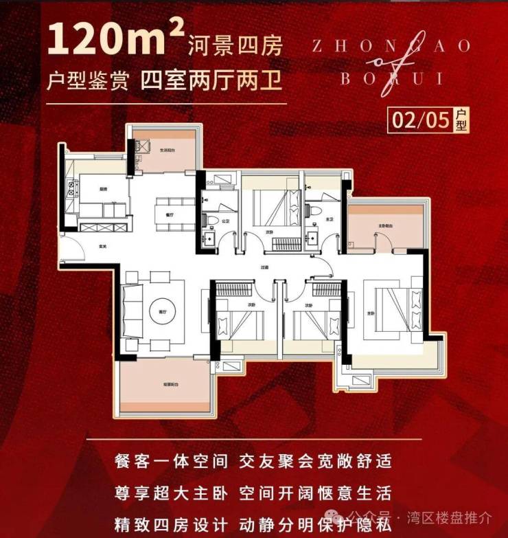 新品面积:120㎡四房两卫(南北)及89㎡三房一卫(河景)