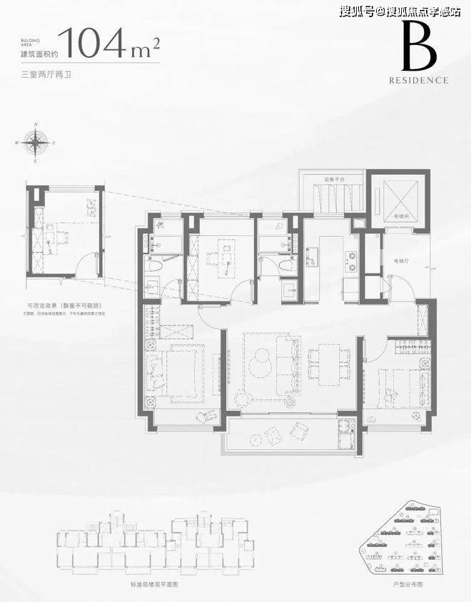 104㎡三房两卫:百平米大横厅设计,南向超大面宽采光,配备三段式干湿分离卫生间,提升居住舒适度。
