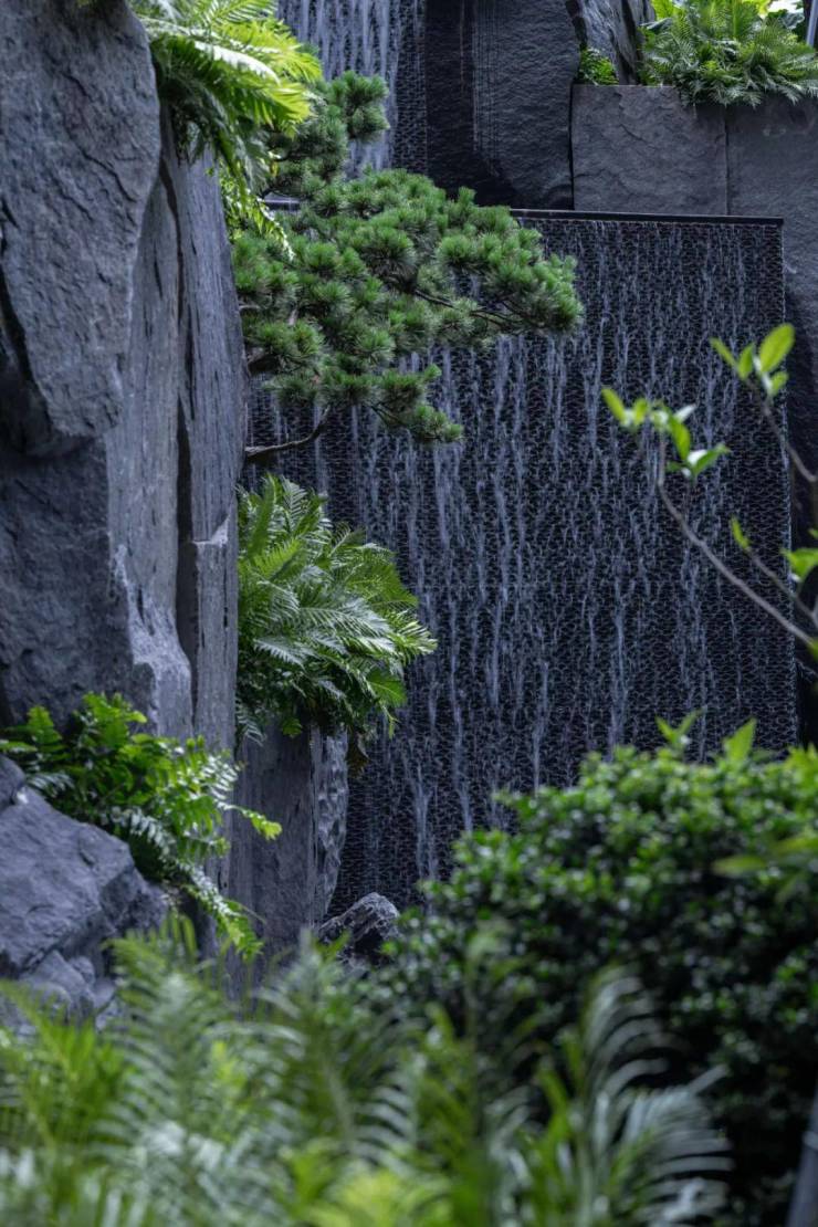 院内山石层叠,流水飞瀑从山石上冲击而下,像一条真正的山中瀑布。