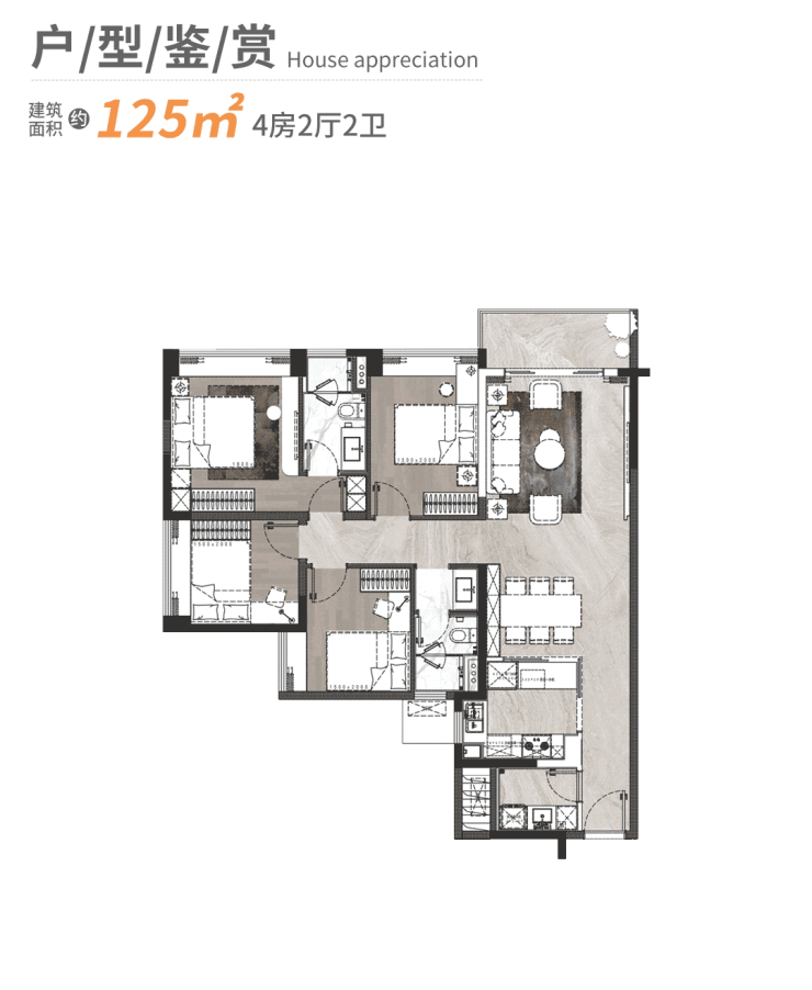 建面约140㎡户型:是整个项目货量最多,最主打的户型,分为横厅和竖厅设计。